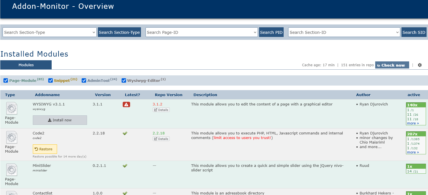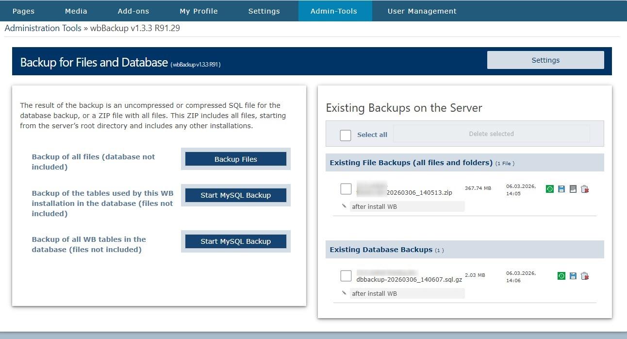 Create file and database backups from the backend, with safety backups, backup notes and restore function. |